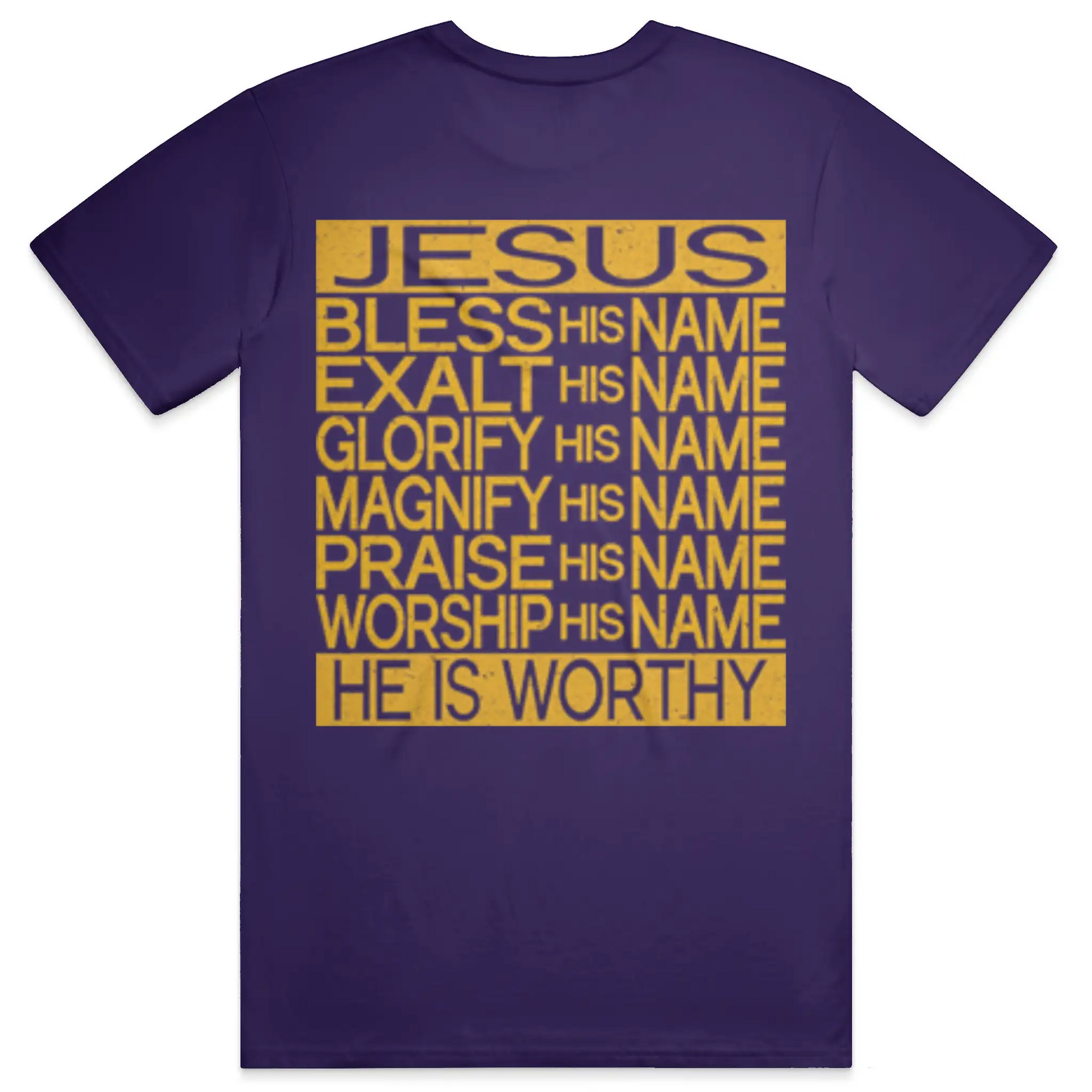 Turn it around and the message deepens. A commanding back graphic lifts the name JESUS, surrounded by a litany of praise—