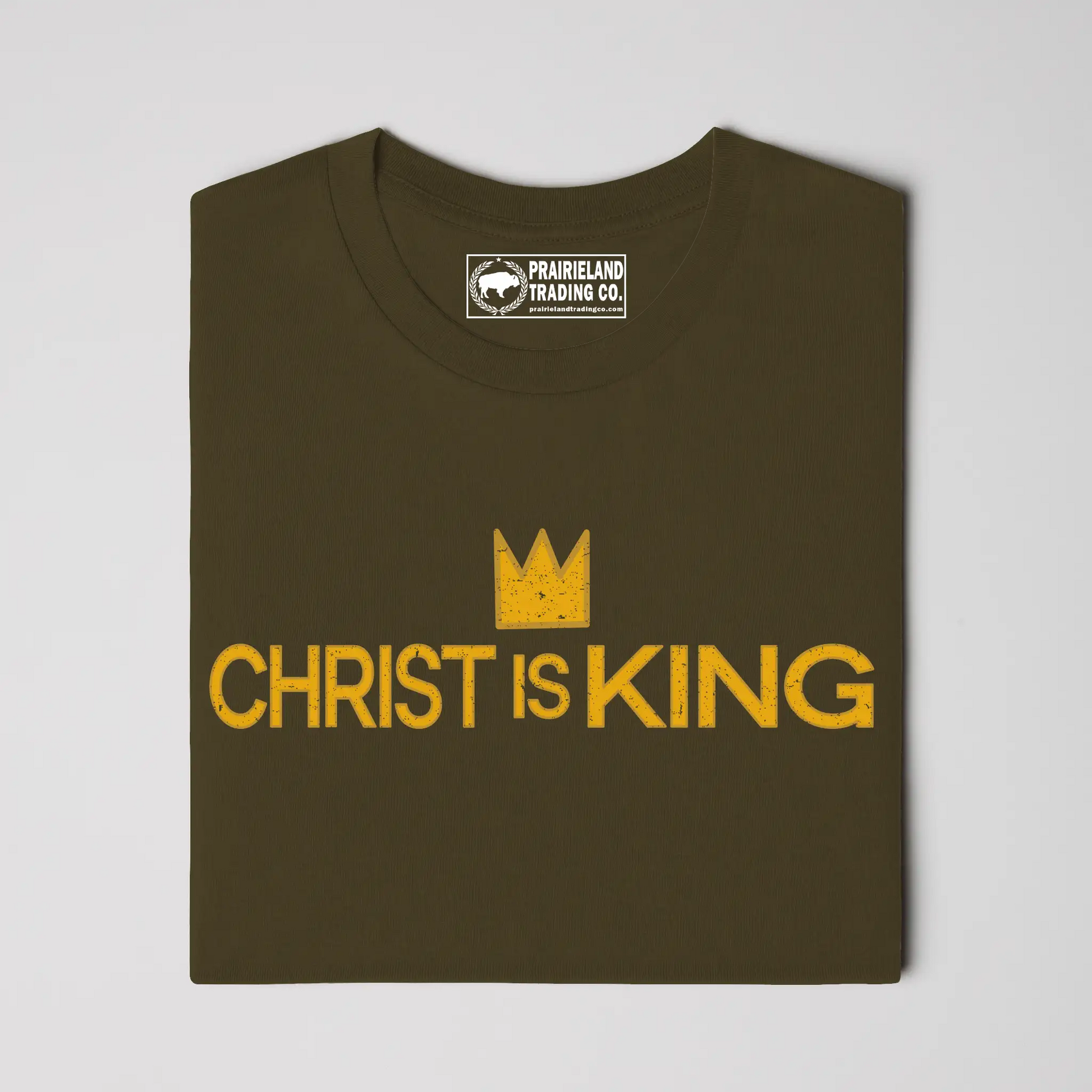 The Christ Is King — Crowned Glory Tee fuses sacred declaration with modern street-art influence. The front makes an unmistakable statement: CHRIST IS KING in bold, distressed block lettering, crowned with a Basquiat-inspired three-point crown—resting right where it belongs. Centered cleanly below the collar, it’s designed to hit with intention, not noise.
